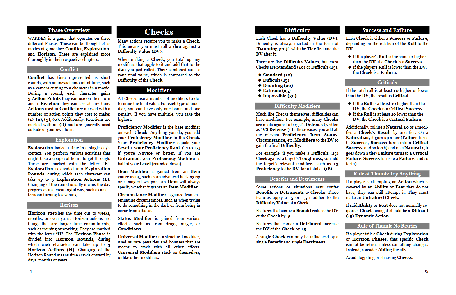 WARDEN is designed to be a branching game that expands from a simple core, that being the d20 + Modifier rolls.